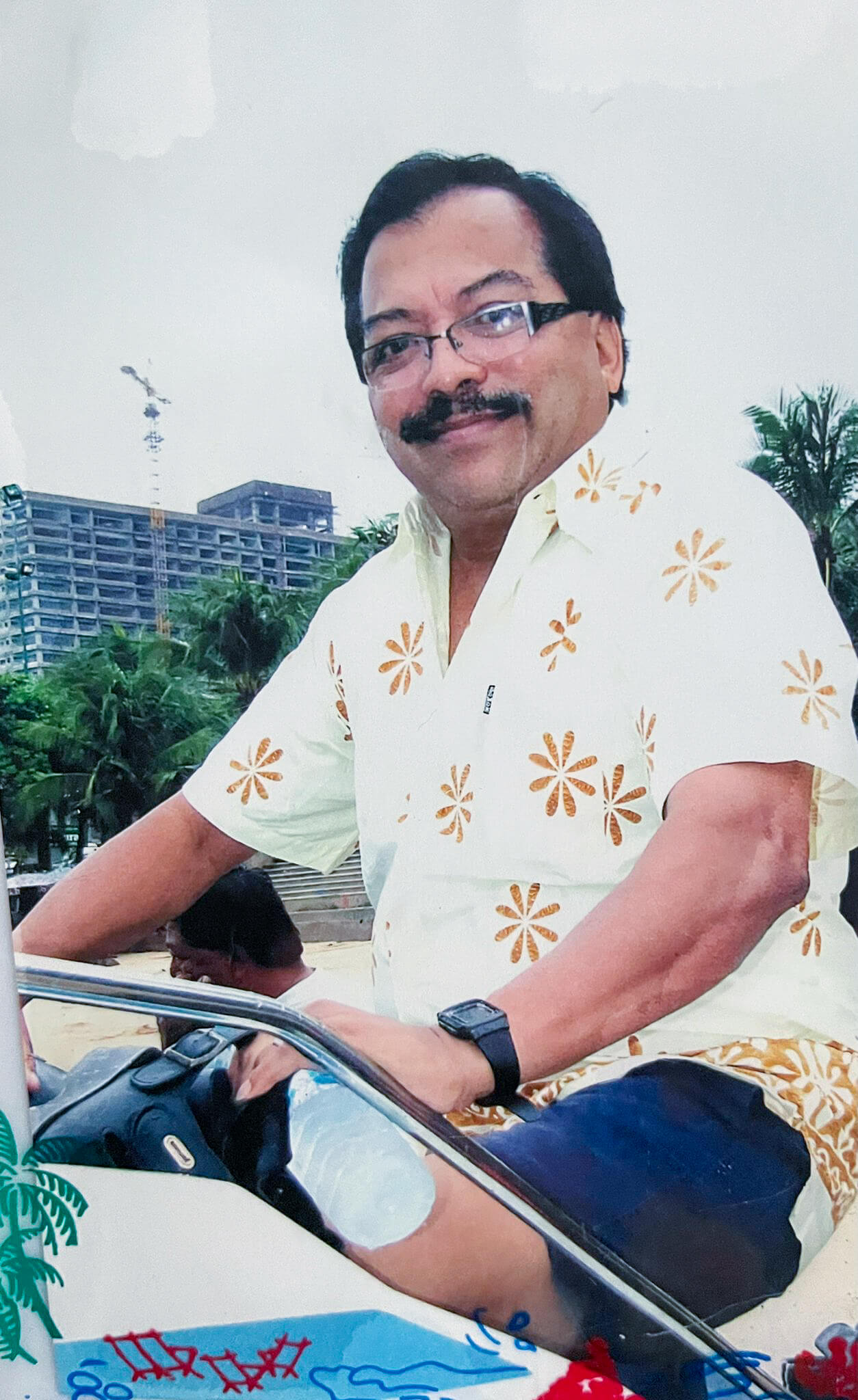 We envision our father, right now, lounging bare-chested in a deckchair, sporting navy shorts in Air-India suit material, with black silver-buckled leather belt and sandals; left ankle on right knee; sipping a glass of whisky and soda, on ice - nestled in the borough of heaven that offers the choicest food and music, and the finest view of his grandchildren on earth.